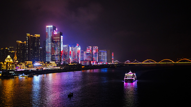 Бляскава нощна гледка на река Сяндзян в град Чанша