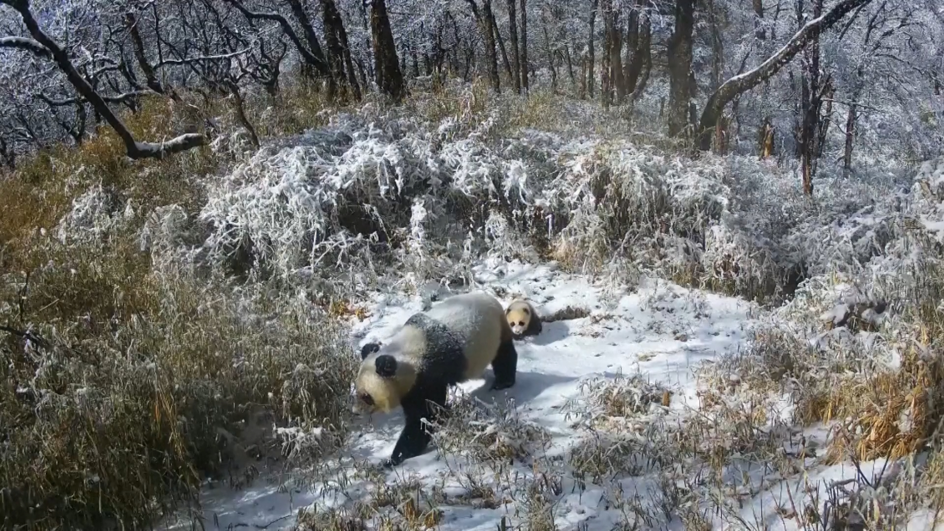 Дива гигантска панда и нейното малко на разходка в снега