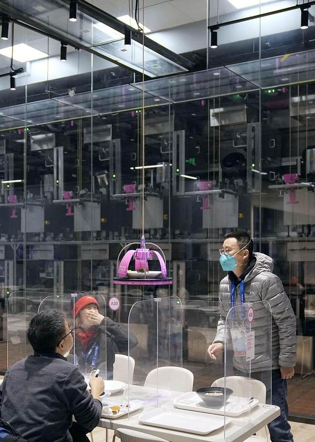 Месо с картофи, топчета от скариди, дзяодзъ, спагети, хамбургери, алкохолни напитки… В ресторанта на Олимпийския пресцентър 120 роботи готвачи денонощно се грижат за храната на гостите. Те приготвят храната веднага след като получат поръчката. След това други роботи безконтактно доставят ястията до масите. По този начин в голяма степен се намалява риска от предаване на заразата.